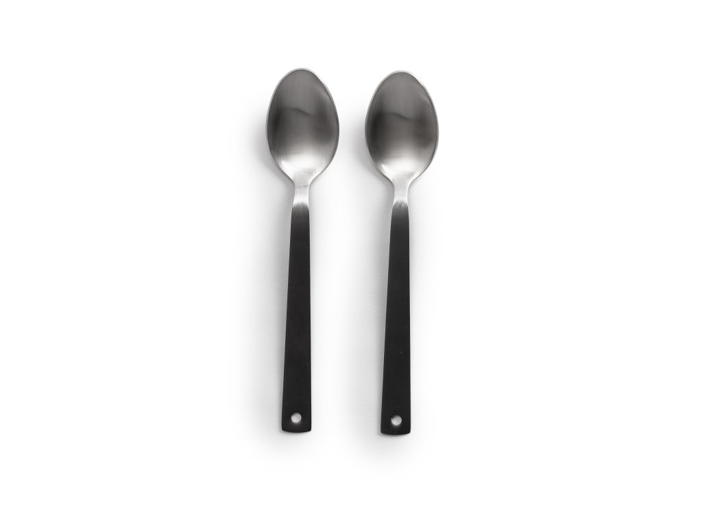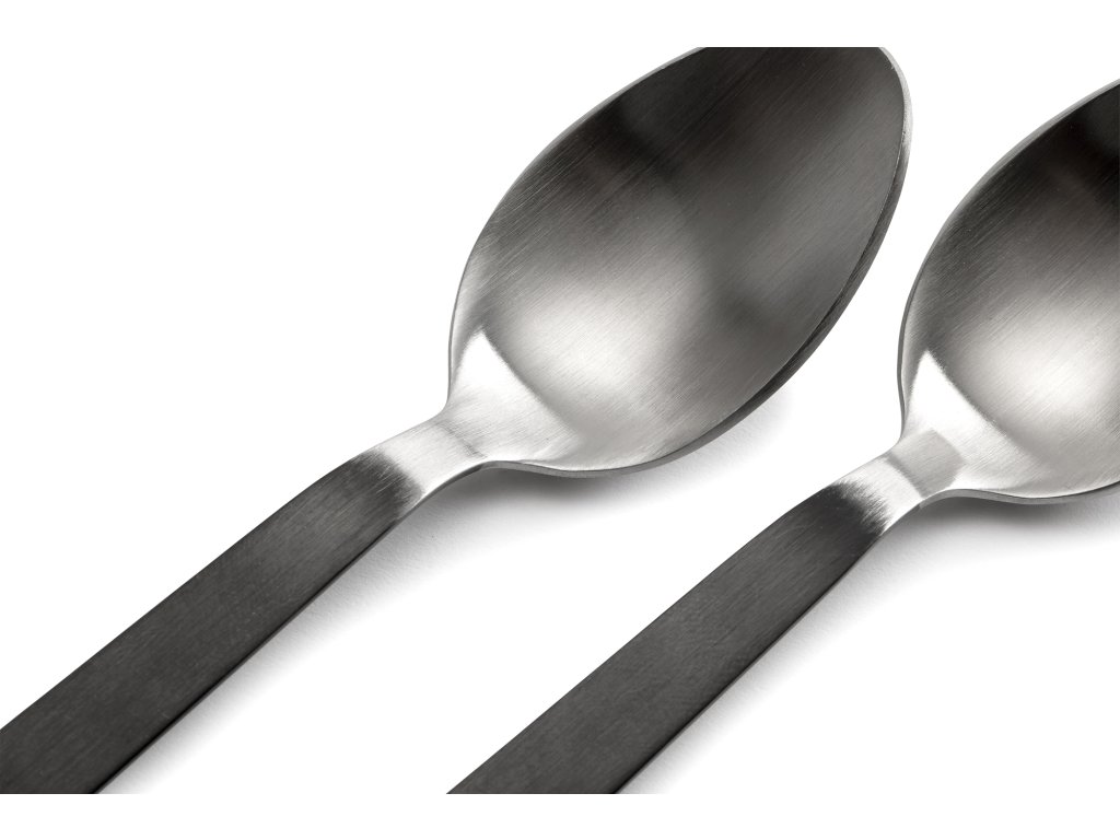 Minimalistická sada příborů kombinuje lesklou nerezovou ocel s matnou karbonovou úpravou pro jedinečný vzhled. Obsahuje 2 vidličky, 2 nože a 2 lžíce, vhodné pro použití doma i venku. Součástí je ocelové poutko a lněný sáček pro ochranu a uspořádání. Příbory jsou vhodné do myčky.