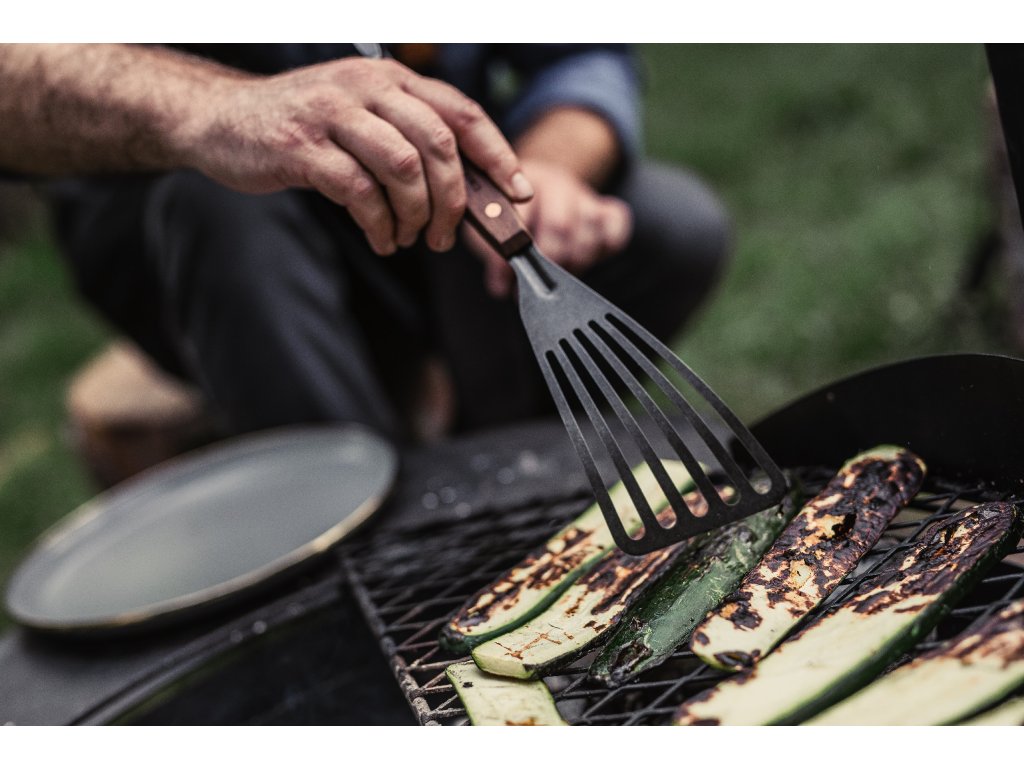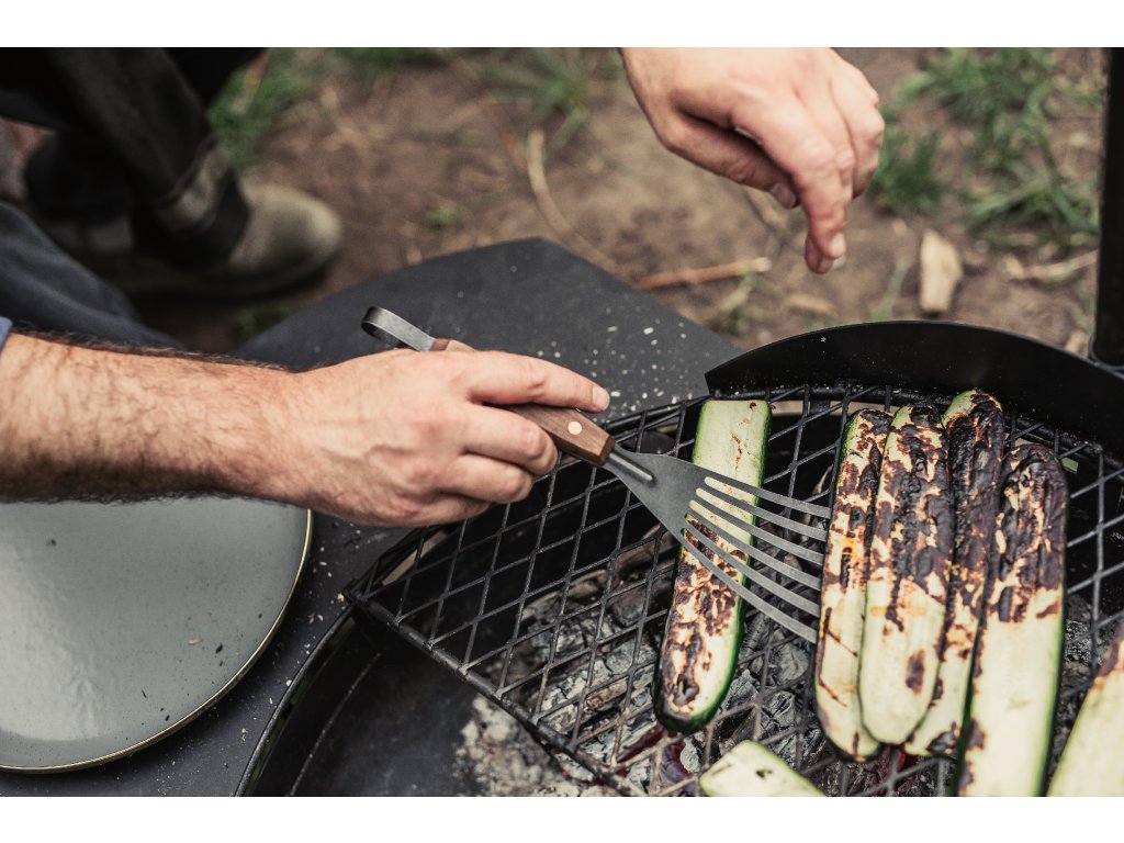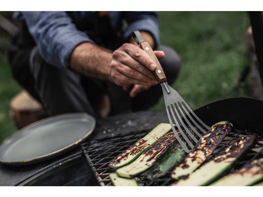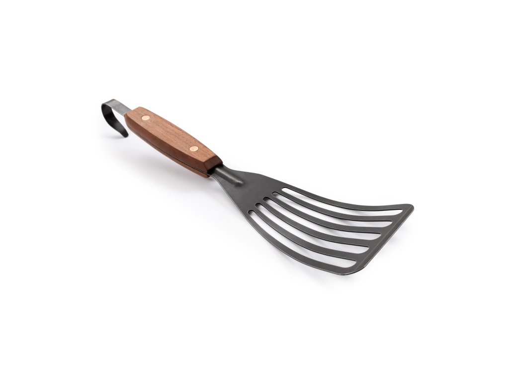 Ergonomická rukojeť z přírodního ořechového dřeva zůstává chladná i při vysokých teplotách a zajišťuje pohodlný úchop. Špachtle je vybavena praktickým háčkem pro zavěšení, což usnadňuje skladování a organizaci při přípravě jídel u grilu nebo ohniště.