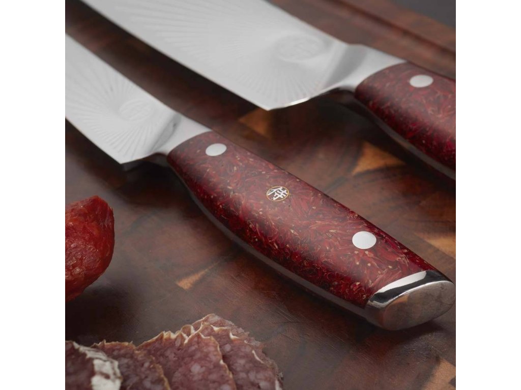 Mohutná barevná rukojeť z rýžových zrn, která jsou spojena epoxidovou pryskyřicí Vám připomene, že to není jen obyčejný nůž. Stane se klenotem Vaší kuchyně a poskytne vzrušení a výkon, který Vás nadchne. Rukojeť je ozdobena středovým mozaikovým nýtem s japonským znakem samurajů. Trojité nýtování zajišťuje dokonalou pevnost, stabilitu a spojení zářícího ostří a rukojeti.