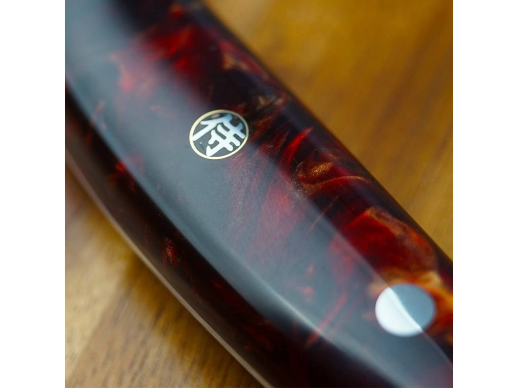 Rukojeť je vyrobena z překrásné epoxidové pryskyřice. Jedná se o průhlednou pryskyřici probarvenou alkoholovými pigmenty, které mohou časem měnit barvu. Navíc je ozdobená středovým mozaikovým nýtem se znakem samurajů. Trojité nýtování zajišťuje dokonalou pevnost, stabilitu a spojení damaškového ostří a rukojeti. Rukojeť je pečlivě ručně leštěná, ergonomicky tvarovaná a navržená pro vynikající ruční ovládání. Speciálně navržený tvar rukojeti je vhodný pro asijský úchop nože. Pryskyřice je voděodolná a zcela bez zápachu, nevyžaduje prakticky žádnou údržbu. Nezačne v průběhu času korodovat, oxidovat, zůstane stejně tvrdá a pevná.