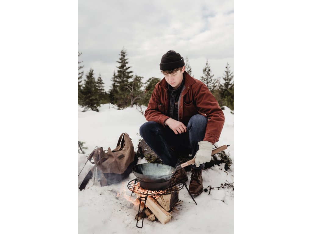Pánev je navržena pro použití na otevřeném ohni, plynovém sporáku nebo jako přenosný gril. Stabilní ocelový stojan s průměrem 9,5" umožňuje pánvi stát v ideální poloze pro vaření, aniž byste ji museli držet. Multifunkční design pánve umožňuje umístit do stojanu grilovací brikety pro okamžitou úpravu na gril.