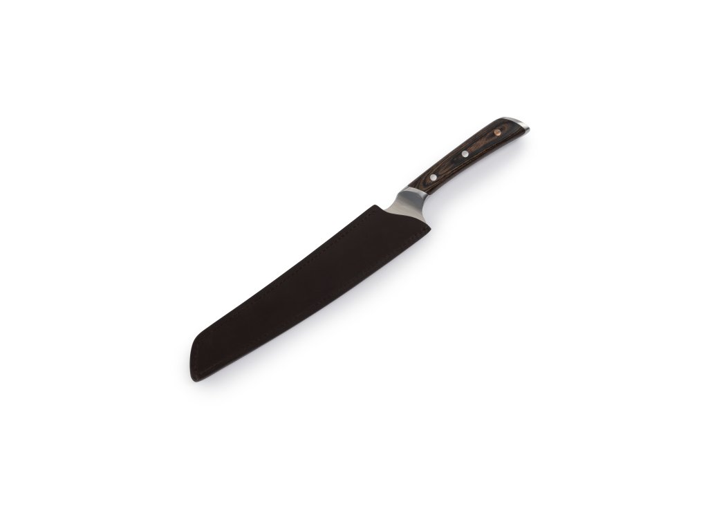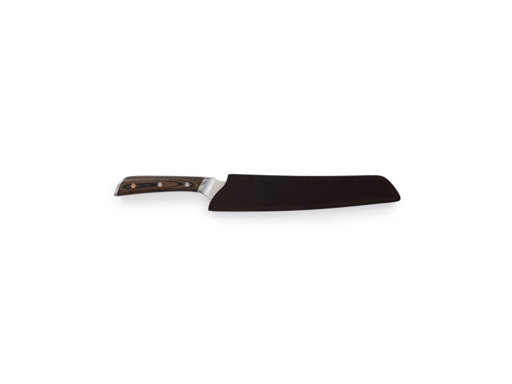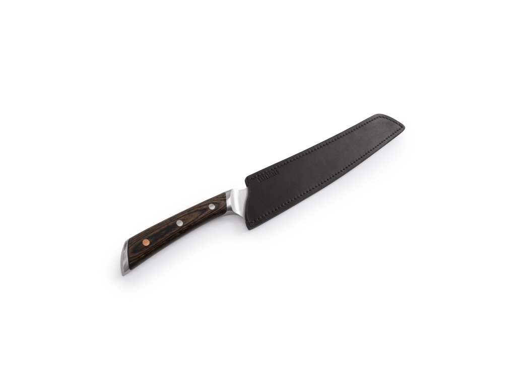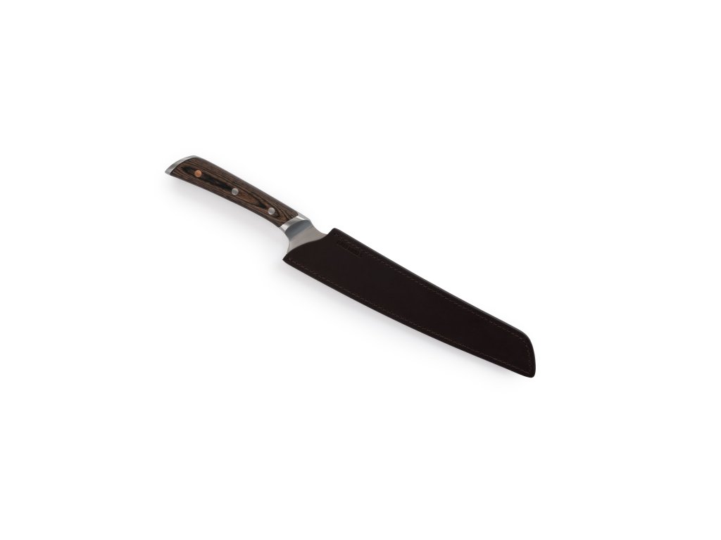 Čepel z německé nerezové oceli 50CrMoV15 je kovaná v plné konstrukci tang, což zajišťuje pevnost, odolnost a dlouhou životnost. Výřezy na čepeli pro palec a prsty umožňují profesionální úchop a precizní ovládání. Rukojeť z Pakkawoodu je ergonomicky tvarovaná, vyvážená a odolná vůči teplu i vlhkosti. Kožené pouzdro z plnozrnné hovězí kůže chrání čepel a s časem získává krásnou patinu, čímž zvyšuje estetiku a funkčnost nože.