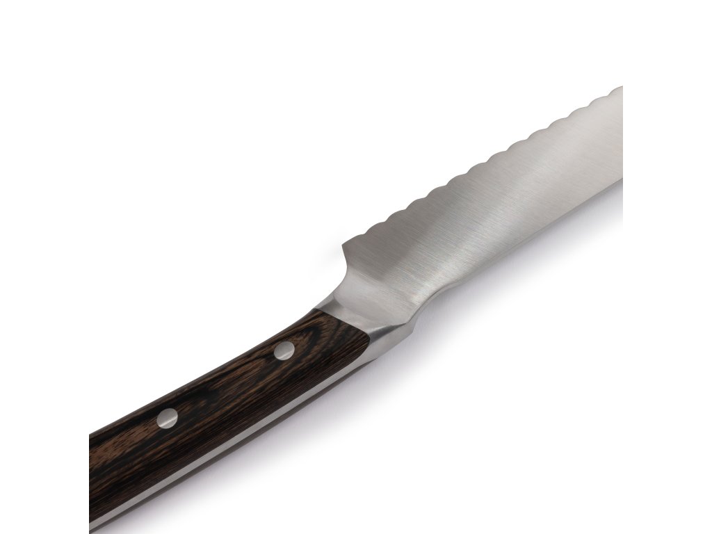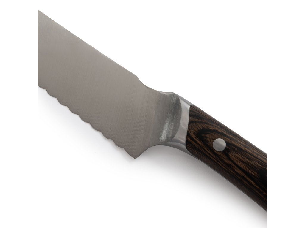 Jakmile jednou vyzkoušíte nůž na chléb, už se bez něj neobejdete. Tento nůž s 14" tenkou čepelí a ostrým zoubkovaným ostřím zajišťuje přesné a snadné krájení pečiva, od bagelů přes dorty až po bagety. Díky prodloužené délce a zoubkované čepeli hravě zvládnete i silnější bochníky chleba, a to s přesností, která u standardních nožů chybí. Navíc jej můžete využít i jako všestranný nůž na delikatesy pro tenké plátky masa.