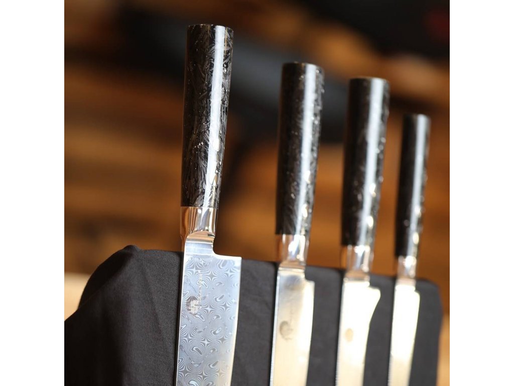 Velmi lehká karbonová rukojeť působí moderním a téměř dokonalým dojmem. Stane se klenotem Vaší kuchyně a společně s mimořádným ostřím poskytne vzrušení a výkon, který Vás nadchne. Dvojité nýtování zajišťuje dokonalou pevnost, stabilitu a spojení zářícího ostří a rukojeti z materiálů určených pro vesmírný program.