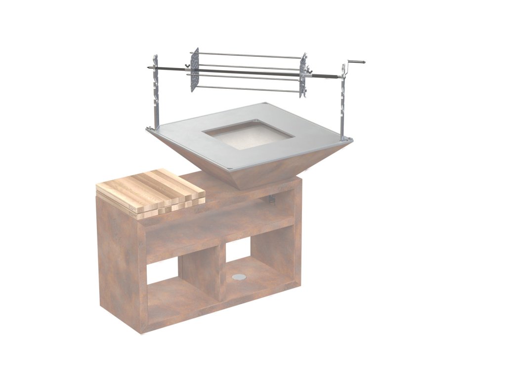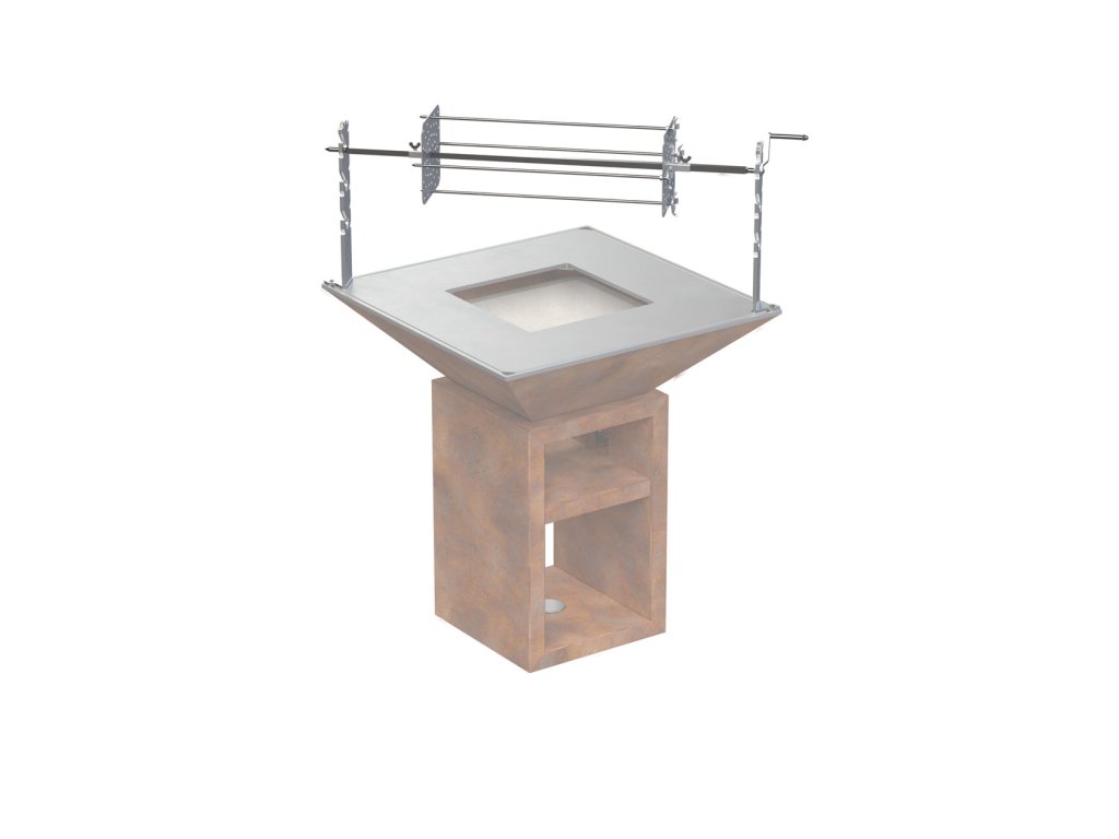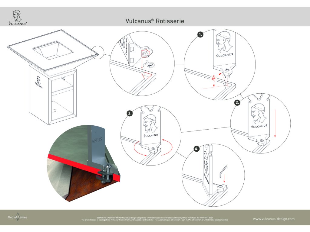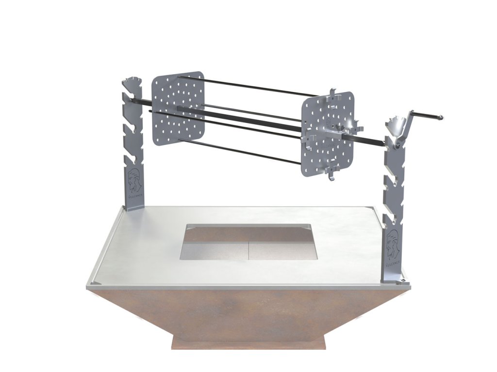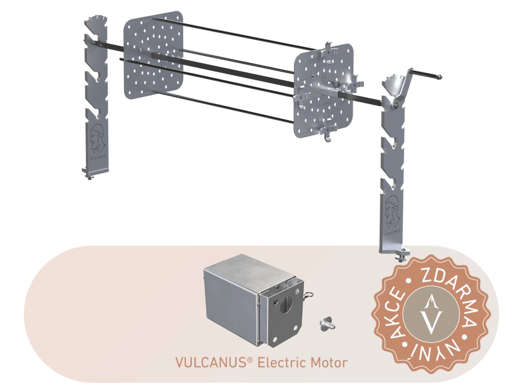 Rotisserie disponuje nekompromisním motorem (příslušenství) s kapacitou až 40 kg, což umožňuje grilování i větších kusů masa bez jakýchkoliv problémů. Celá sestava je vyrobena z masivní nerezové oceli, čímž je zaručena maximální životnost – přesně v duchu produktů Vulcanus. Hlavní nosné nohy jsou vyrobené z pevné nerezové oceli o rozměrech 10 × 80 mm, zatímco hlavní rotisserie část je tvořena plným nerezovým čtyřhranem o velikosti 16 × 16 mm.